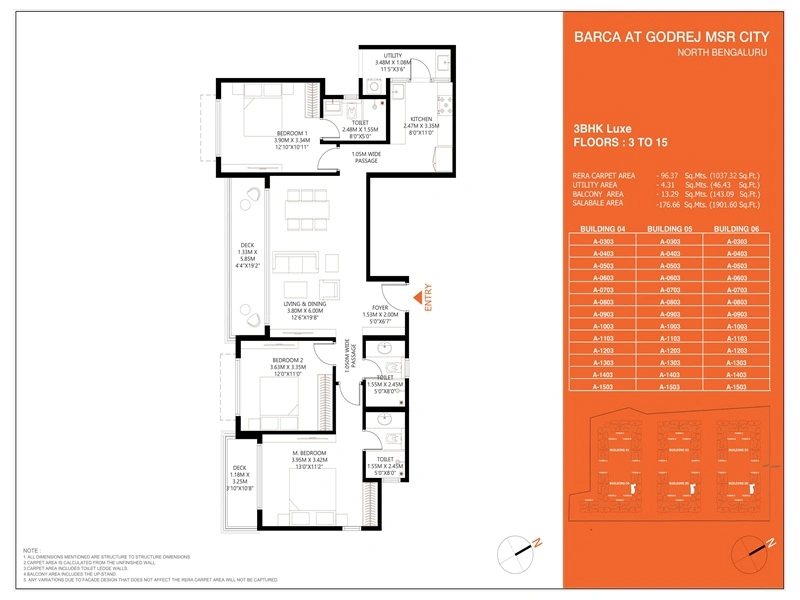 The 3 BHK apartments are perfect choice for larger families or those seeking more living and storage space. Each unit features: